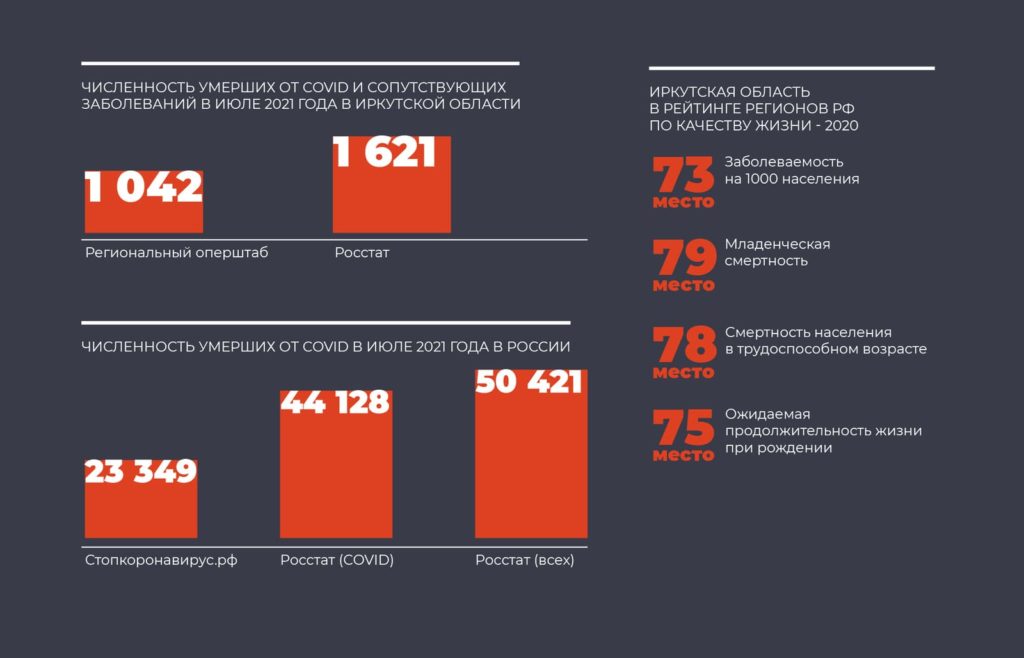 Всего, по данным оперштаба, в июле 2021 года в Иркутской области умерли 1048 человек. По данным Росстата — 1621 человек. Вам, как и мне, прежде всего бросается в глаза, что данные оперштаба отличаются от данных Росстата, причём значительно. Чьи данные верны, я не могу сказать. Наверное, нужно спросить у тех, кто эти данные публикует. И те и другие цифры — совершенно официальные, взяты из открытых источников.