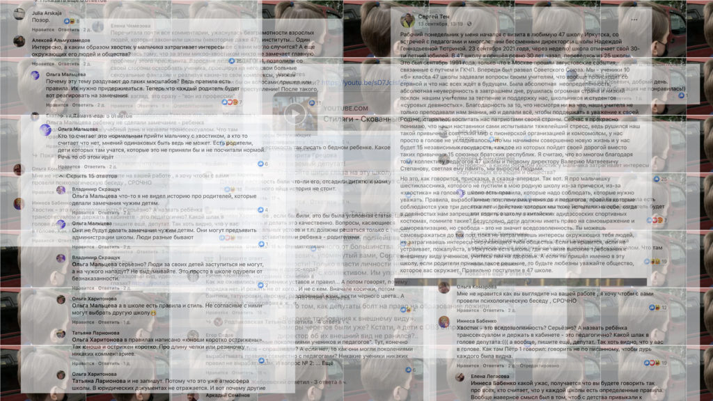 Перед выборами в сентябре историю с причёской прокомментировал депутат Государственной Думы, тогда кандидат в депутаты от «Единой России» Сергей Тен. Сейчас он снова стал депутатом. «Если не нравится, если не устраивает, пожалуйста, в Иркутске есть школы, где не такие высокие требования к внешнему виду учеников, учитесь там на здоровье. А если ты пришёл именно в эту школу, если родители приняли такое решение, то будьте любезны, уважайте общество, которое вас окружает. Правильно поступили в 47 школе», — написал депутат Тен и опубликовал фотографию, где он стоит в школе вместе с директором (орфография и пунктуация источника сохранены — ЛБ). Этот пост в Фейсбуке вывел дискуссию на новый виток.