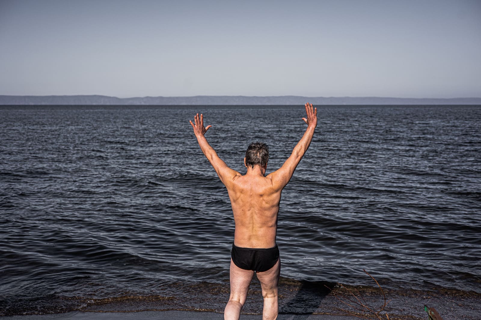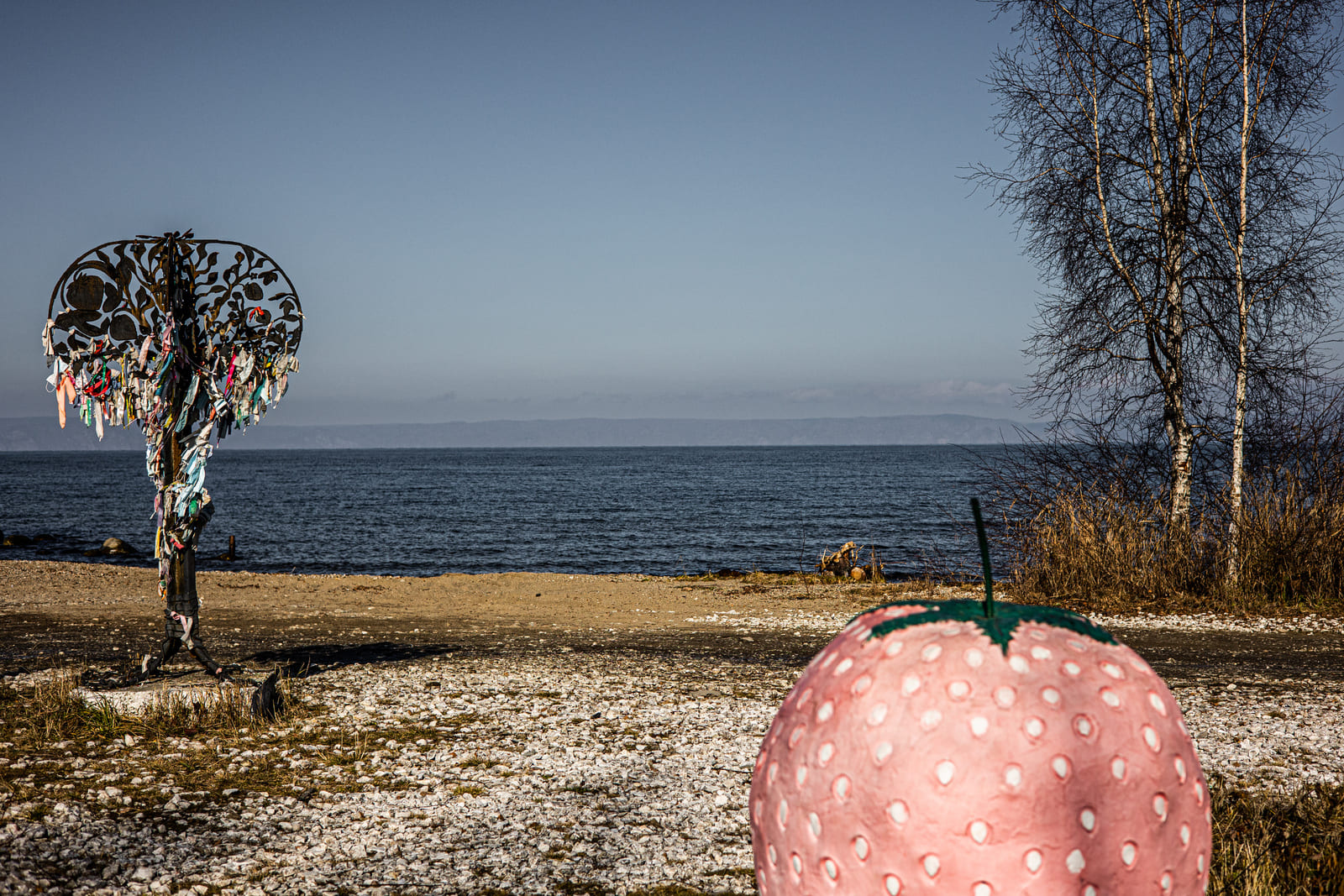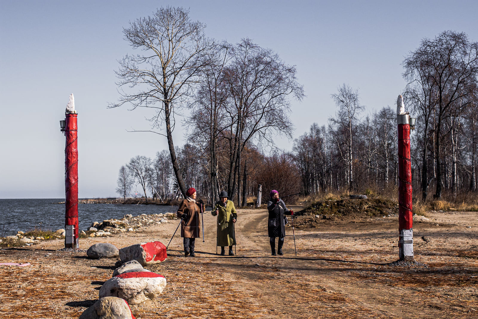 На набережную — узкую полосу крупной гальки — заезжает «лендкрузер», из него выскакивают три женщины в стильных пуховиках. «Девочки, не зря ехали сюда из Иркутска», — говорит одна. Она открывает шампанское и разливает его по бокалам. Женщины чокаются и танцуют под трек Скриптонита. Вскоре они выкидывают пустую бутылку в урну, сделанную в виде клубники — бренда Байкальска. Михалёв смотрит на иркутянок и снова сплёвывает.