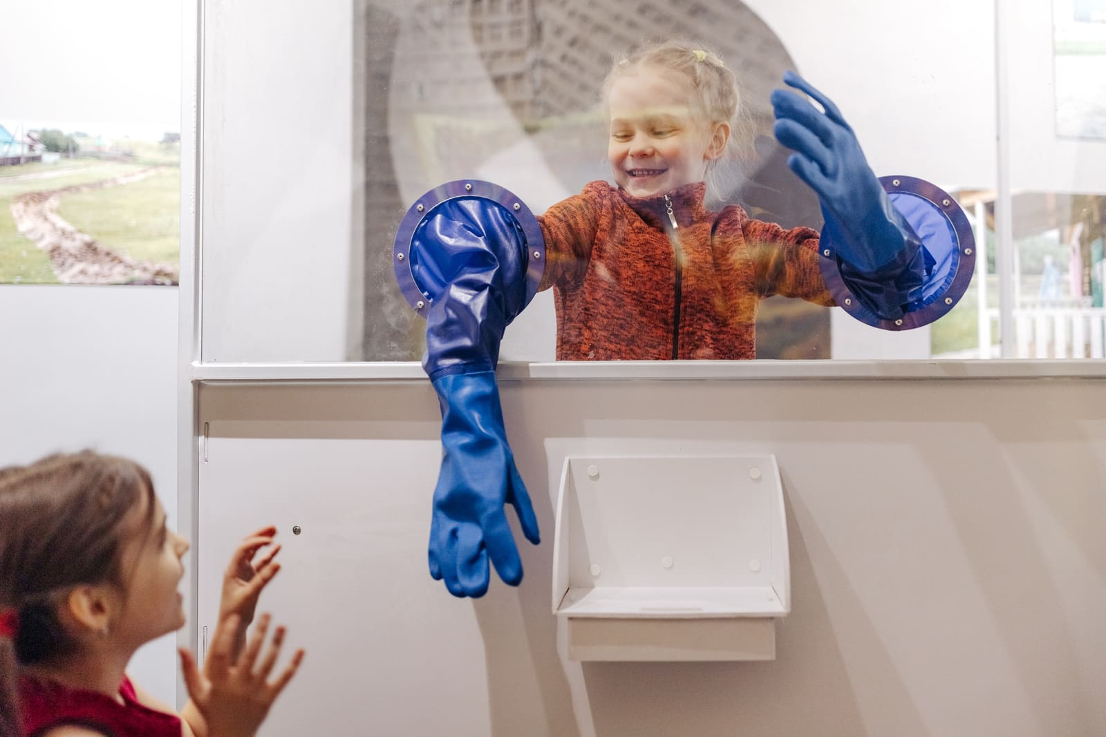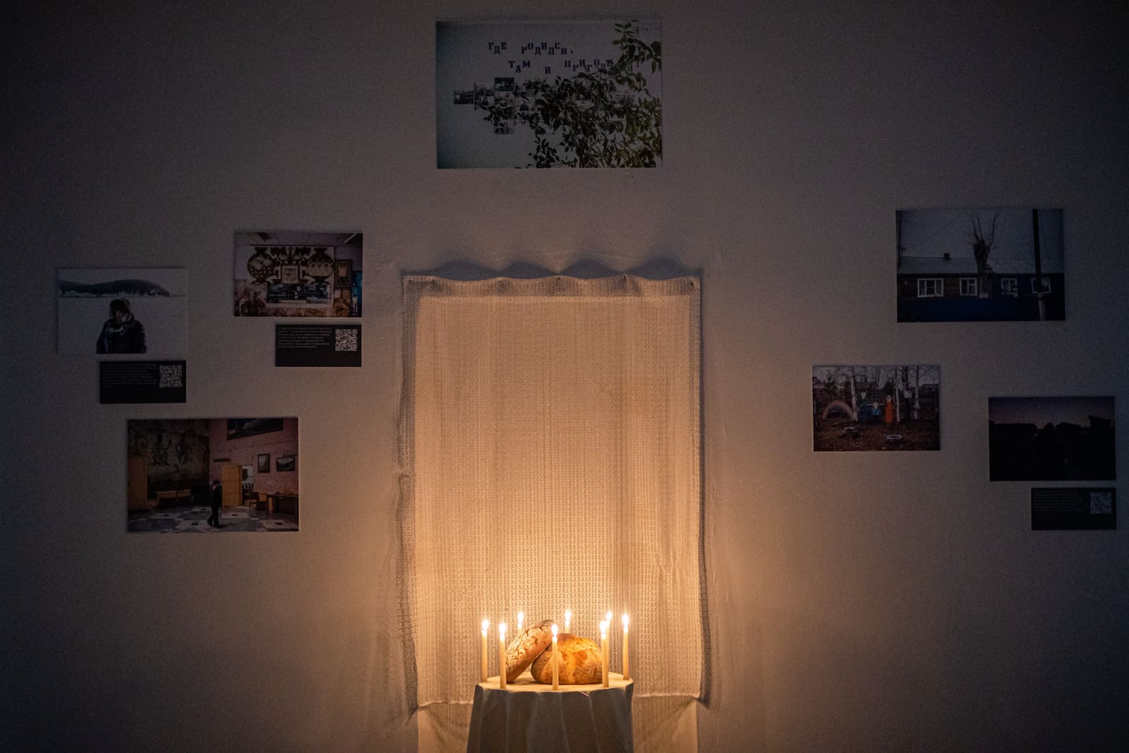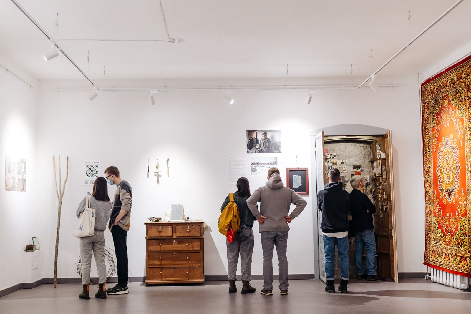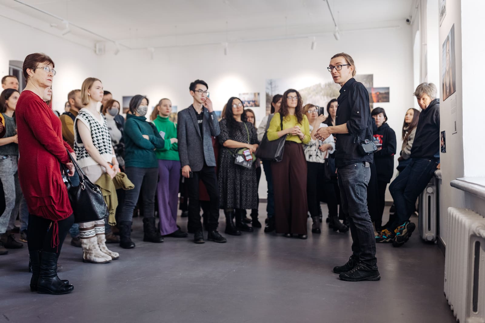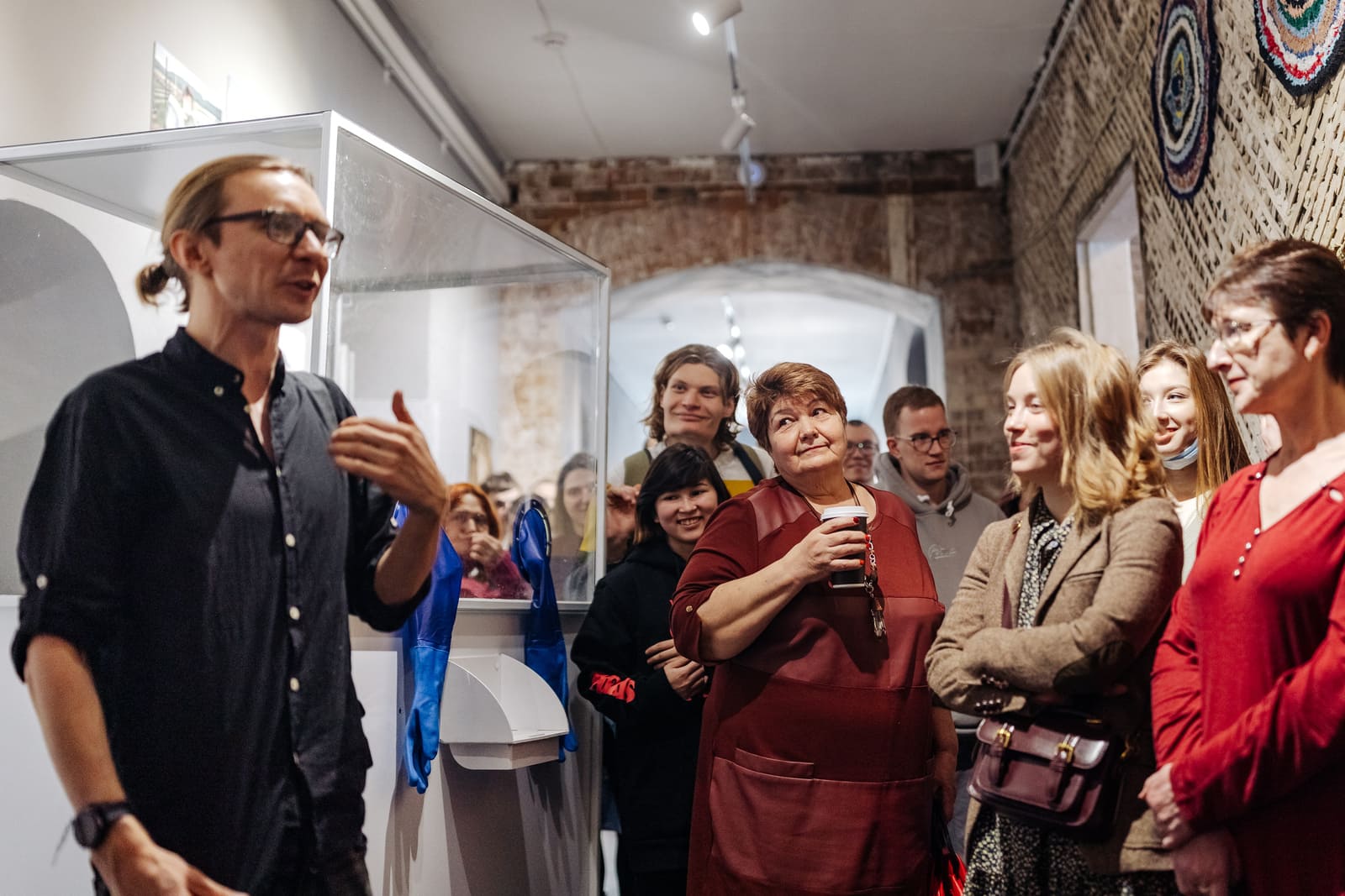 Открытие выставки началось с авторской экскурсии Антона Климова. Он рассказал, почему на входе посетителей встречает странная пластиковая кабинка с синими руками-перчатками. Это антиковидный блокпост, копия того, что был установлен в бурятском улусе Шулута в начале пандемии коронавируса.
