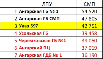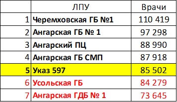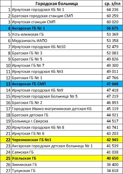 В рейтинге уровня зарплат реорганизованные больницы Усолья и Черемхова занимают нижние строчки. Ангарские медики получают больше. В первой Ангарской больнице заработок медиков в среднем в 1,4 раза выше, чем в реорганизованной Усольской.