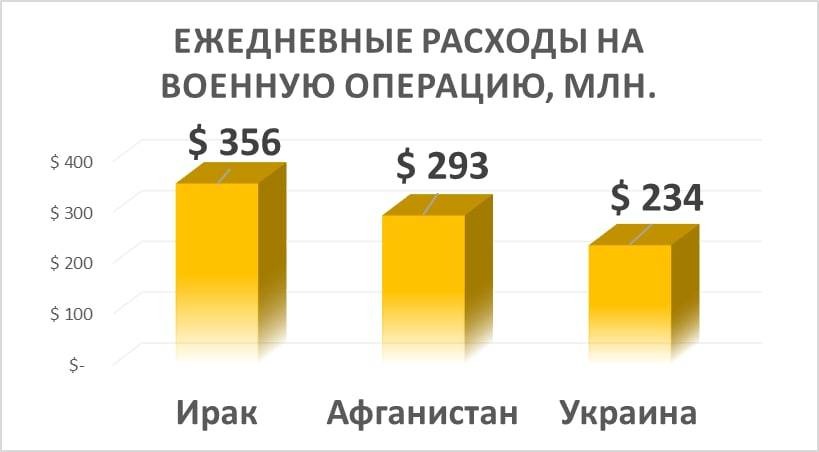 Ежедневные расходы США в Ираке в 2007 году, когда там находился наиболее значительный воинский контингент в 150 тысяч человек, составляли около 356 миллионов долларов. В 2011 году в Афганистане, когда там находилось порядка 94 тысячи американских военных, ежедневные расходы составляли не менее 293 миллионов долларов в день.