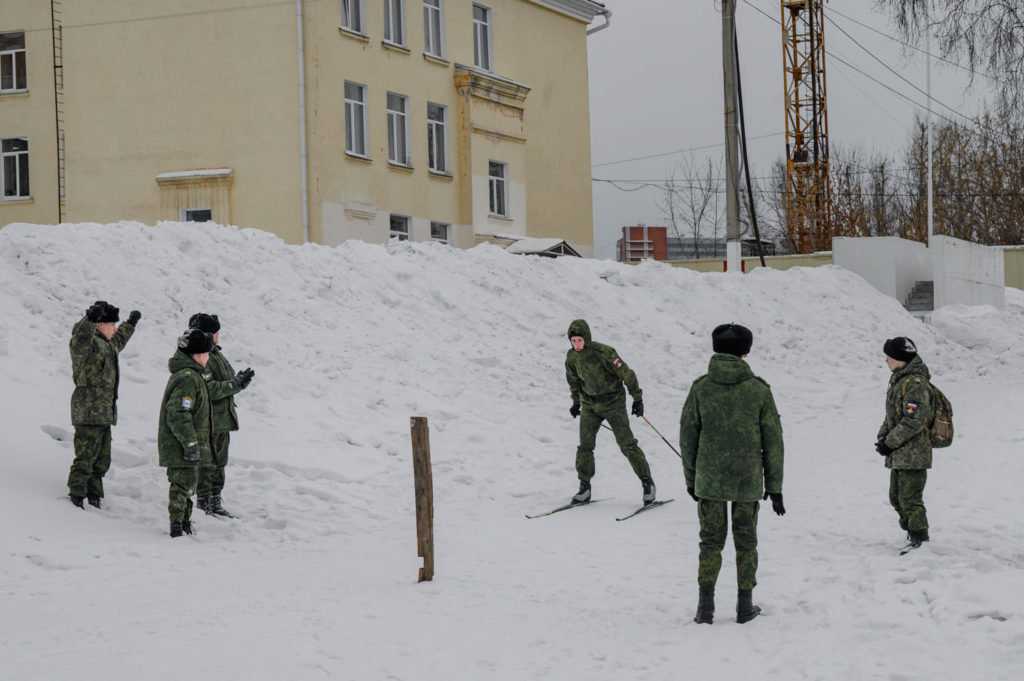 16 февраля в кадетском корпусе были соревнования по биатлону. Лыжи для биатлона выдаёт кадетский корпус. Всего в биатлоне участвуют 20 кадет: от каждого из пяти классов по четыре человека. Стартуют они по одному, из корпуса выходят командами по четыре человека. Один кадет бежит, остальные готовятся, надевают лыжи и катаются на них неподалёку, чтобы не замёрзнуть. Каждому из участников нужно проехать два круга на лыжах по территории корпуса, четыре раза выстрелить по мишеням из пневматического оружия и сделать ещё один, завершающий, круг на лыжах. Если во время бега у кадета что-то случится с лыжей, его однокурсники быстро принесут замену: забег идёт на время.
