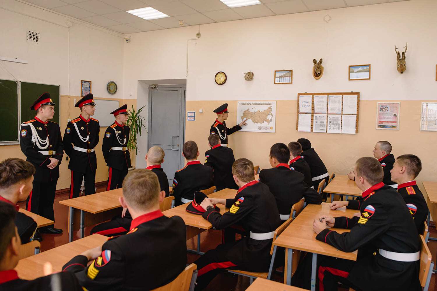 Чёрную парадную форму на урок кадеты надевают только по особенным случаям. Например, в День учителя, когда в корпусе проходит день самоуправления. Кадеты полностью заменяют учителей и администрацию. Кадеты-пятикурсники (в кадетском училище пятый курс — это как 11 класс в обычной школе) проводят уроки в младших классах. На фото пятикурсник ведёт географию у кадет четвёртого курса. Анна Диденко рассказывает, что ученики слушали старшекурсников внимательнее, чем в обычное время учителей. «Это не показуха, — говорит она, — это дисциплина. Ученики реально выполняют задания, а „учителя“ объясняют всё максимально подробно».
