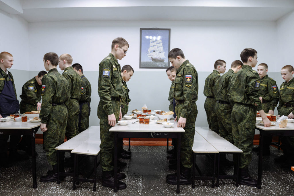 В столовой каждый день есть дежурные. Они накрывают на стол и убирают после того, как класс поест. Перед каждым приёмом пищи в корпусе построение. Дневальный — дежурный кадет, который следит за соблюдением дневного порядка, — подходит к столу, докладывает воспитателю, что его класс готов к приёму пищи. Воспитатель отвечает: «На ужин у вас десять минут, приятного аппетита», — и мальчики быстро едят. «Если не отвлекаться, доесть они успевают», — говорит Диденко. Когда последний кадет доедает, весь класс по команде встаёт. Кадеты поднимают лавки, крепят их под столами и идут в казарму.