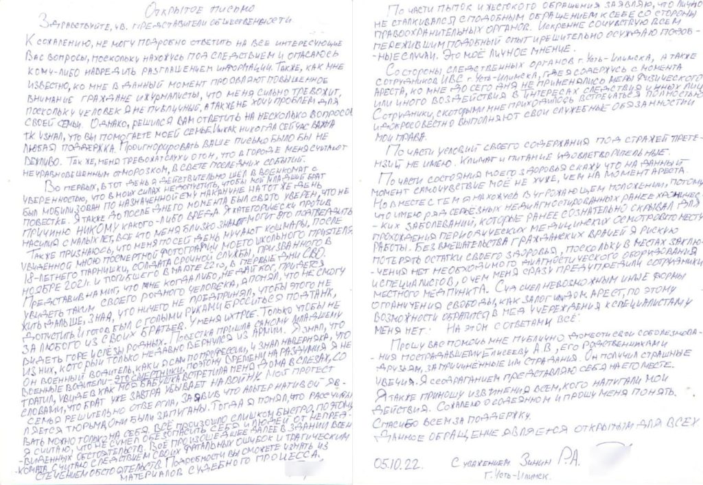 В письме Зинин рассказал, что не сталкивался с пытками со стороны силовиков и добавил, что его права никто не нарушает. Однако, он нуждается в помощи гражданских врачей, «поскольку в местах заключения нет необходимого диагностического оборудования». Марина Зинина добавила, что у сына бронхиальная астма, и любой приступ может привести к ухудшению его здоровья. Она передала в СИЗО ингалятор и лекарства, но не знает, получил ли их Руслан. «Надеюсь, если начнётся приступ, ему окажут помощь», — добавила она.
