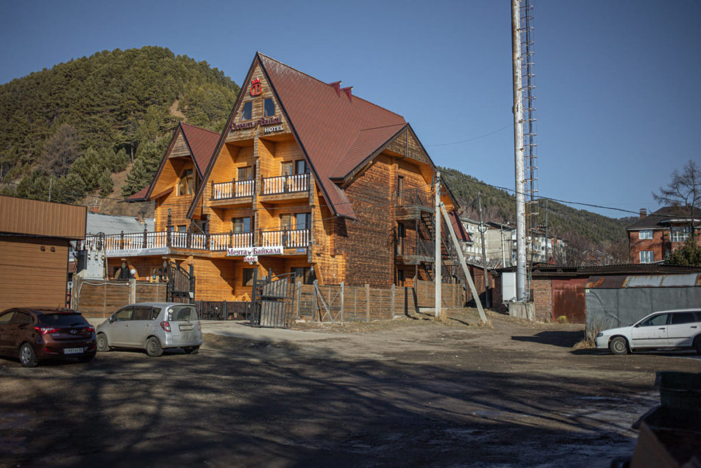 На месте сгоревшей поликлиники остался только длинный гараж. Рядом с ним — два четырёхэтажных деревянных корпуса отеля «Мечта Байкала».