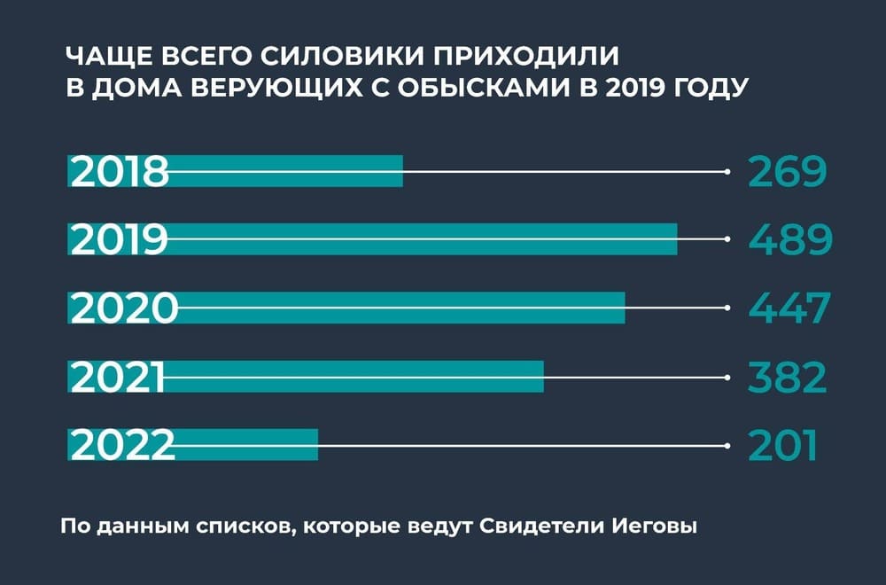 За пять лет после запрета организаций свидетелей Иеговы российские силовики провели в домах верующих около 1,8 тысячи обысков в 71 регионе страны. Рекордным по количеству обысков и задержаний был 2019 год. В дома свидетелей Иеговы врывались почти вдвое чаще, чем в 2018-м: число обысков увеличилось с 269 до 489. Резкое увеличение количества обысков и задержаний произошло сразу после того, как в декабре 2018 года президент Путин пообещал разобраться с тем, что верующих массово записывают в экстремисты и преследуют.