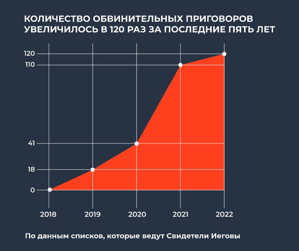 2022 год стал рекордным по количеству обвинительных приговоров для верующих. Власти шли к такому результату несколько лет. Проводить обыски и возбуждать уголовные дела против свидетелей Иеговы начали в 2018, первые приговоры вынесли в 2019 году. Тогда 18 человек признали виновными и назначили им штрафы, условные сроки или лишение свободы.
