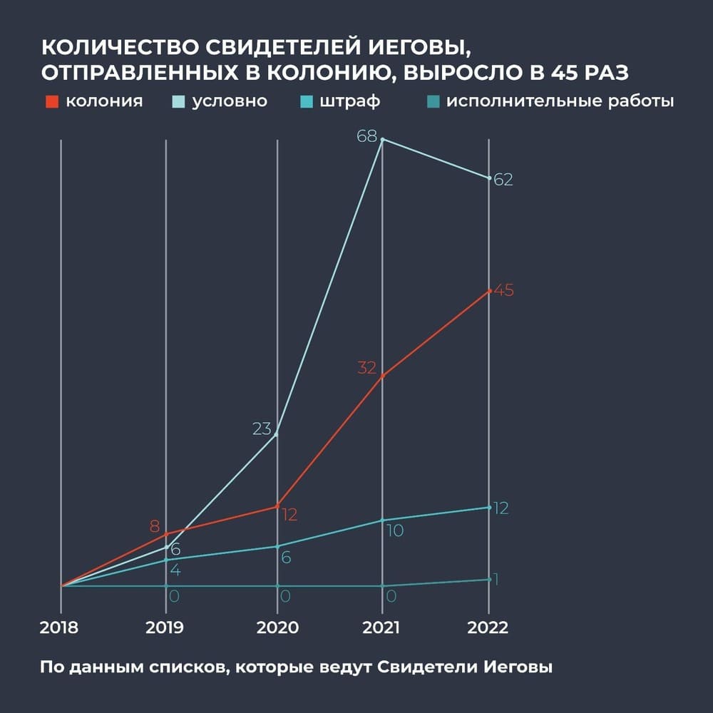 В 2020 году были осуждены 39 верующих, в 2021 — 111. В 2022 году количество осуждённых выросло до 120 человек. 45 из них были отправлены в исправительные колонии. Средний срок заключения — 5 лет 6 месяцев. На сегодня в заключении находятся 115 свидетелей Иеговы: они отбывают наказание либо ждут приговора в СИЗО. В общей сложности с мая 2017 года за решёткой побывали либо там остаются 367 верующих.