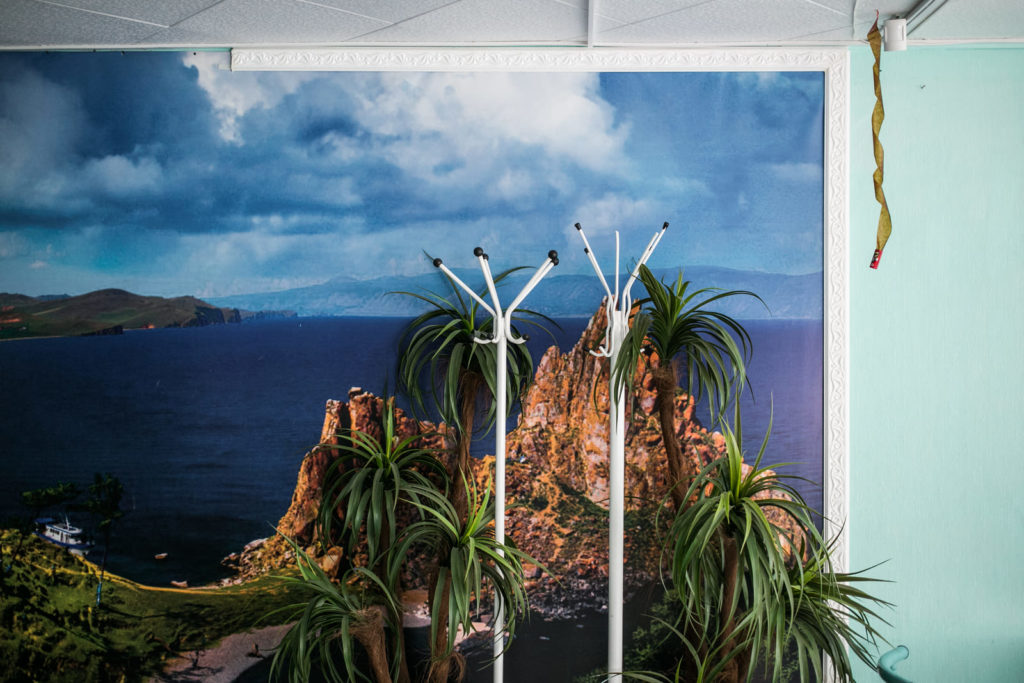 Кафе в посёлке Нижнеангарск — самой северной точке Байкала. Фотообоями с видами природы, цветами обычно украшают стены в деревенских домах и кафе.