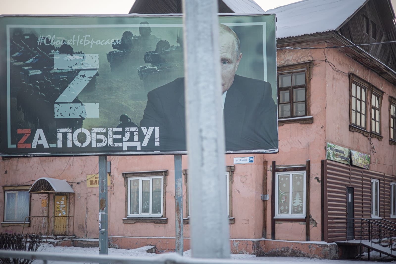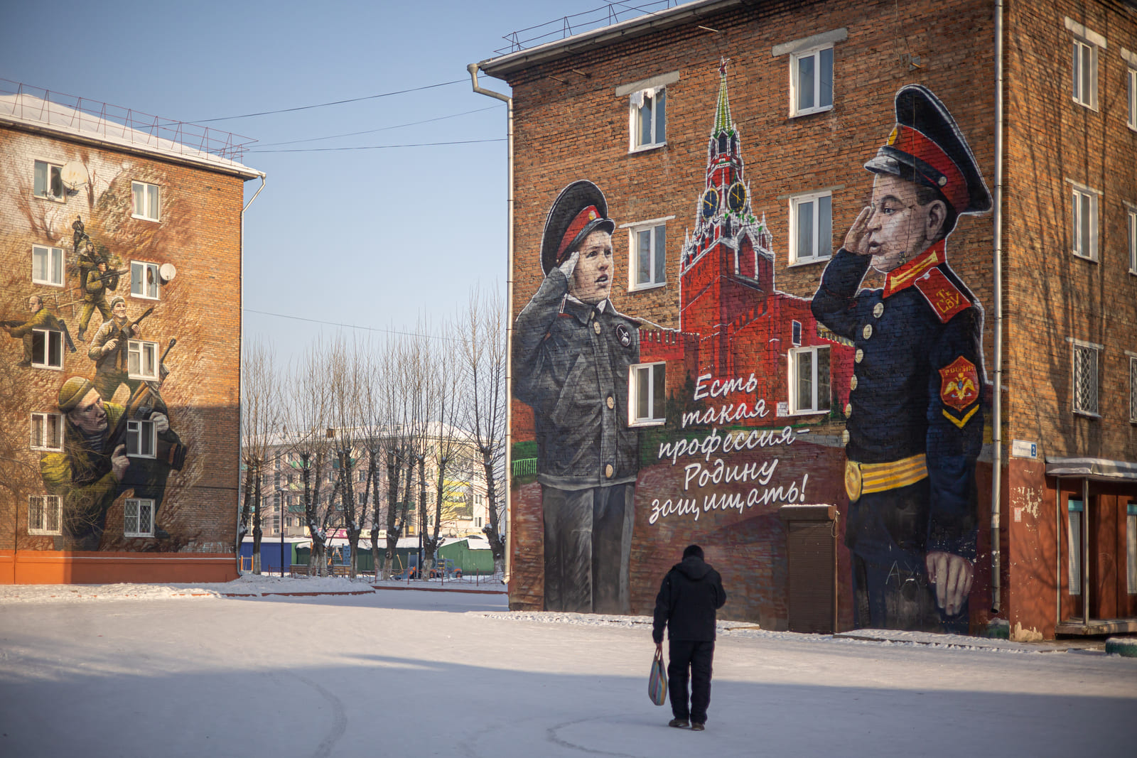 Январь 2023 года. Мэр Свирска Владимир Орноев стоит возле фонтана на улице Лермонтова в Свирске и разговаривает с двумя мальчиками лет восьми-девяти. На Орноеве — ярко-красная куртка и меховые унты. В городе — морозы, и мальчики ёжатся от холода. «Ну как вам рисунки? Что чувствуете?» — спрашивает 61-летний Орноев, показывая на торец ближайшего дома. На нём нарисованы два подростка-кадета, между ними — Кремль.