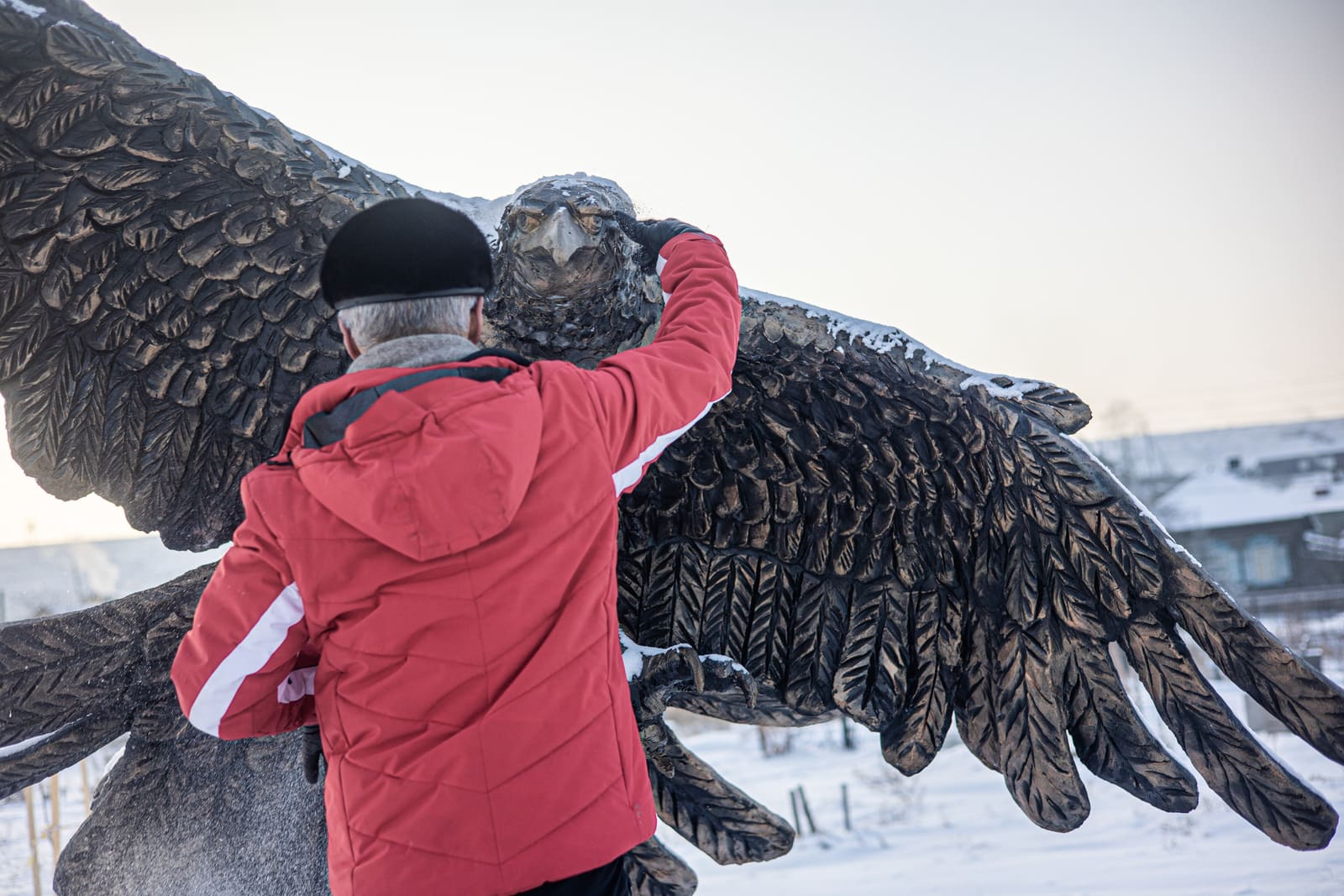 «Раньше наш орёл был какой-то чемоданный, квадратный, тык-тык-тык, — жестикулирует Орноев, показывая руками предыдущий памятник. — Мы потом переделали его лицо. Агрессии не стало вообще! Есть только сила и воля».
