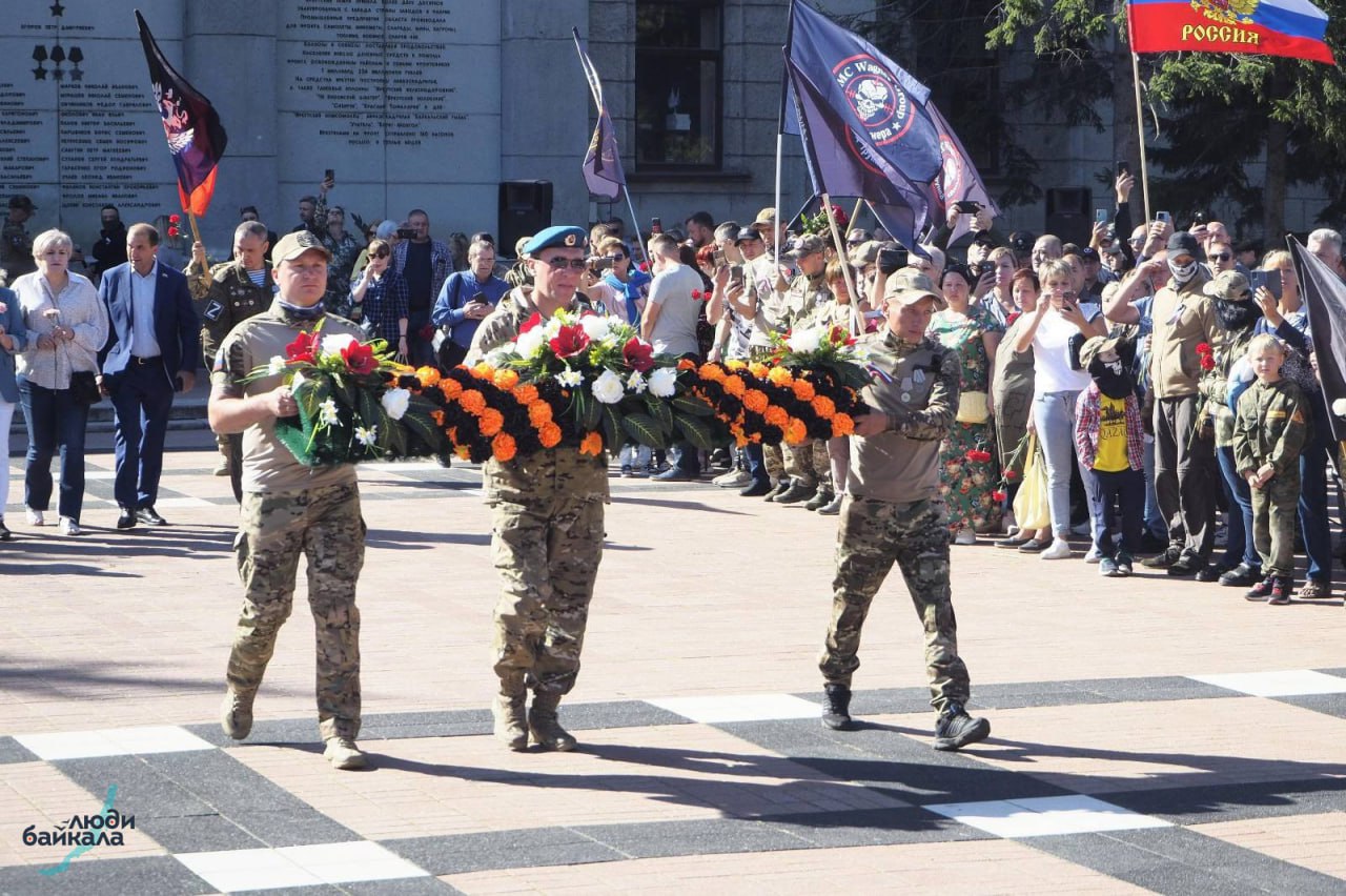 В конце августа, через три дня после смерти главы ЧВК «Вагнер» Евгения Пригожина, в центре Иркутска открывали памятник погибшим наёмникам ЧВК «Вагнер». В толпе стояли родители с детьми, мужчины в камуфляже. Женщины средних лет втроем сжимали красное знамя воевавшей во Вторую мировую войну стрелковой дивизии. Мальчик лет двенадцати двумя руками держал древко, на котором развевался чёрный атласный флаг с черепом — символ частной военной компании.
