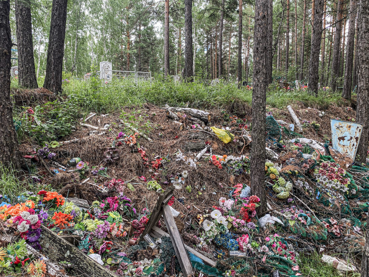 Подобраться к памятникам сложно, почти все ограды — в зарослях травы с человеческий рост. Из-за плодородной почвы и обильных осадков убирать летом там бесполезно, объясняют местные жители: «Нарастёт за неделю». С краю кладбища похоронен Саша Бельский, сын Полины.