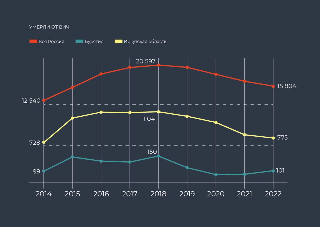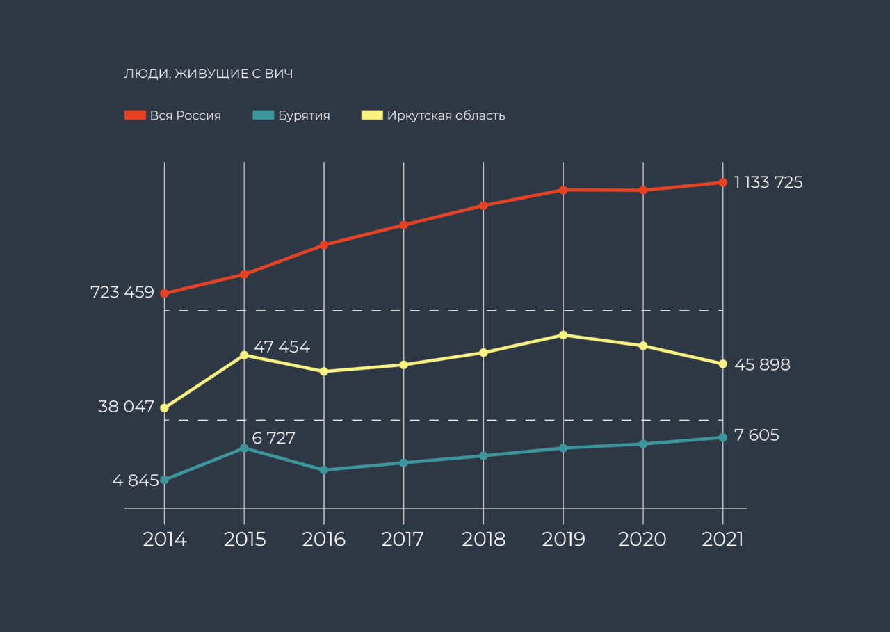 По данным на 31 декабря 2021 года, в Иркутской области ВИЧ-инфекция была диагностирована у 45 898 человек с ВИЧ (+2 505 человек за 2021 год), в Бурятии — 7 605 (+569). Умерли от ВИЧ в 2022 году 775 и 101 человек соответственно.