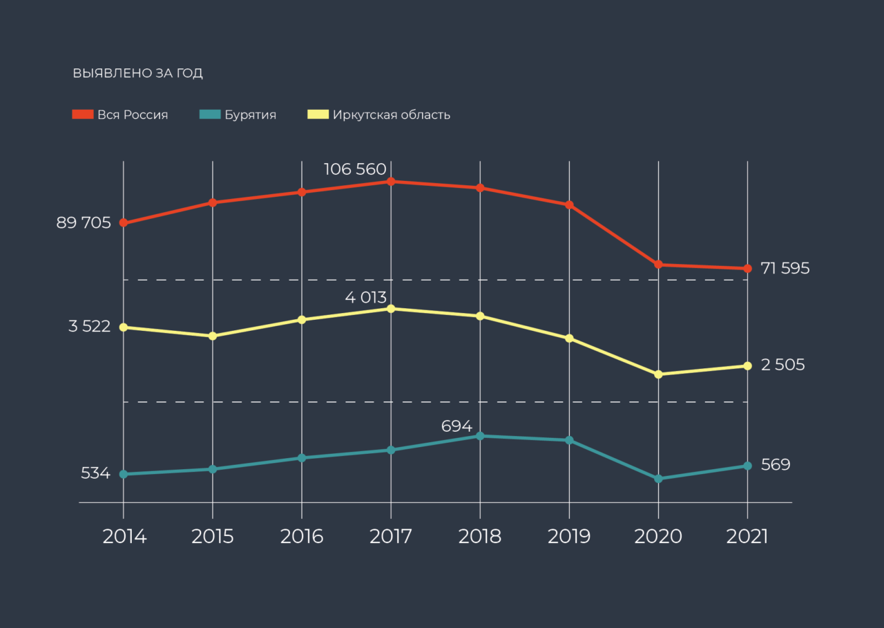Иркутская область также стала одним из регионов, где в прошлом году выявили больше всего новых случаев заболевания — 80 на 100 тысяч человек. Среднероссийский показатель — 39 новых случаев.