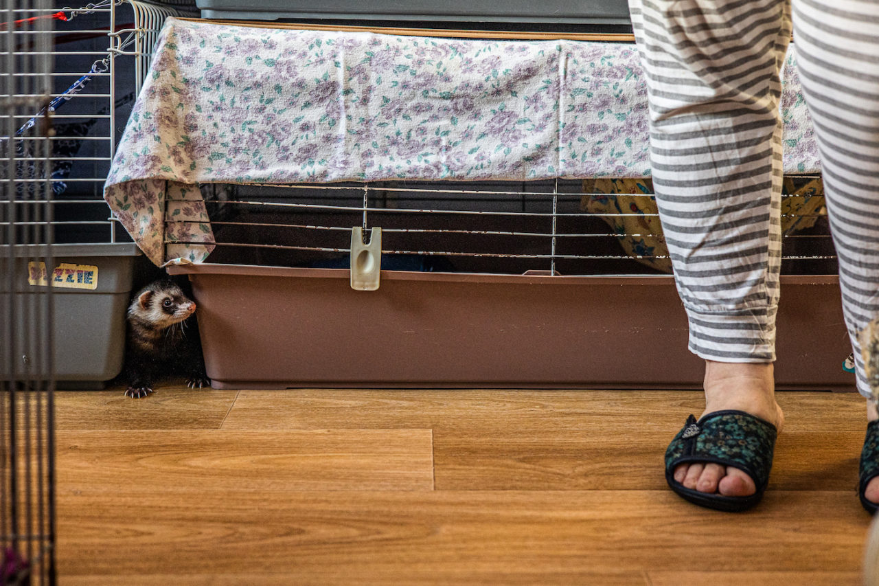 Вдоль стен в два яруса стоят 20 больших переносных клеток. Каждая сверху накрыта пелёнкой для создания темноты. Открыта форточка для прохлады, работает очиститель воздуха. Специфического запаха животных здесь нет — все хорьки стерилизованы. В центре комнаты стоят два вольера с подстилками — сюда по очереди питомцев высаживают «погулять».