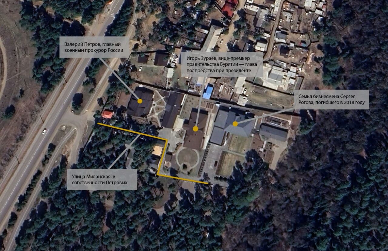 Соседями Петрова на закрытой улице стали его друг, вице-премьер правительства Бурятии — полпред региона в Москве Игорь Зураев и семья местного бизнесмена Сергея Рогова, в 2018 году разбившегося на вертолете неподалеку, выяснили «Люди Байкала» из документов Росреестра.