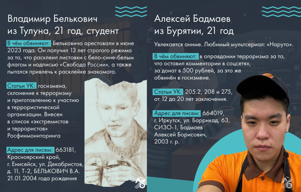 Конечно, описанные в статье дела — далеко не все, случившиеся с начала войны в Иркутской области, Бурятии и Забайкалье. Однако это вся информация, которая нам доступна. Если вы хотите поддержать сидящих в тюрьме, вы можете писать им письма. Почтовые реквизиты большинства мы указали на карточках с их фотографиями. Писать письма безопасно, но имейте в виду, что их читает тюремный цензор, так что лучше избегать резких формулировок. Часто заключенные говорят, что им нравится читать об отвлеченных вещах — о ваших хобби или путешествиях.