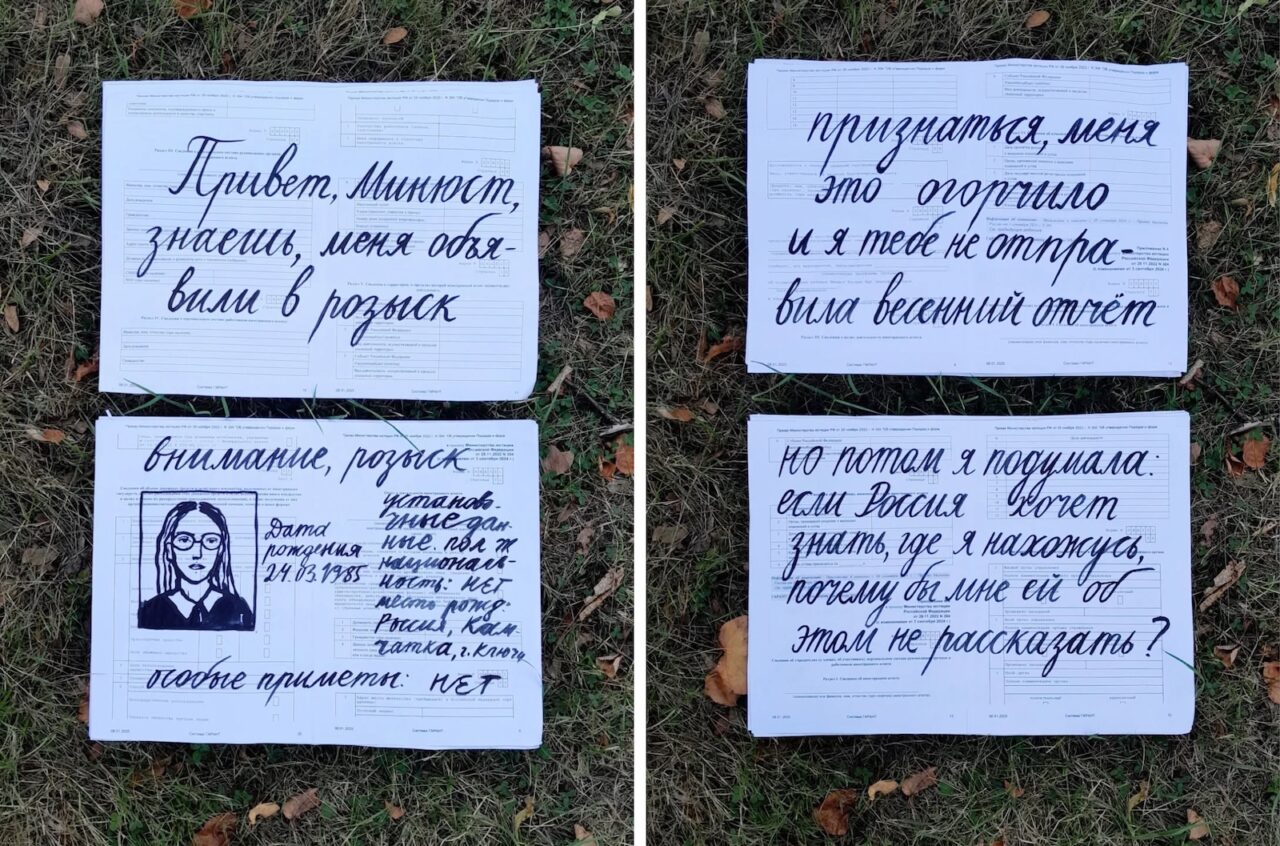 Я не была оригинальна, и на второй выставке «Художники против Кремля» снова выставляла свой отчет в Минюст, в котором рассказываю Минюсту, где я. В период между первой и второй выставками репрессивные органы России объявили меня в розыск, и я подумала, что это хороший повод снова поговорить о репрессиях и войне. Почему бы и нет? Моя страна всё ещё не устала вести войну, а я стараюсь находить в себе силы говорить о том, что я с этим не согласна.