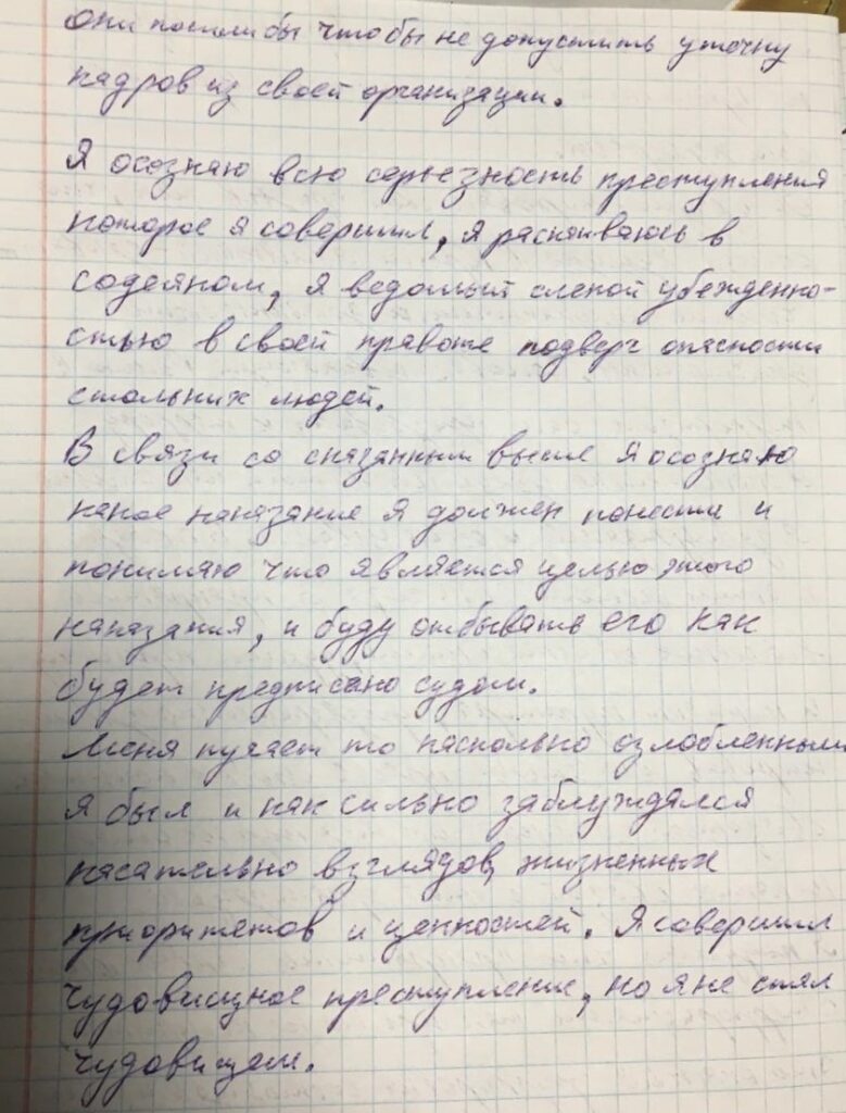 «Если своим призывом я смогу убедить хотя бы одного человека не совершать диверсию, я буду счастлив тем, что моя сломанная жизнь прошла не зря», — заканчивает Семен письмо.