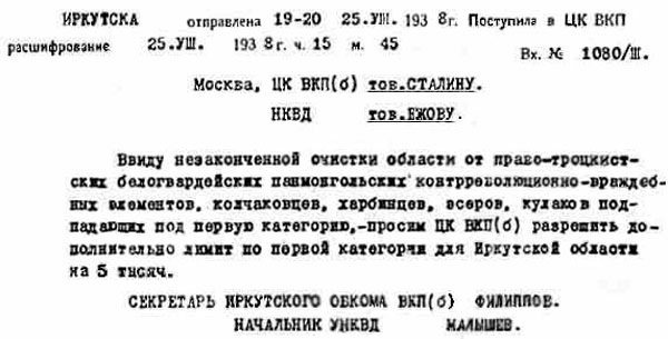 Спустя всего четыре месяца в Москву отправлена новая телеграмма: «Ввиду незаконченной очистки области от право-троцкистских белогвардейских панмонгольских контрреволюционно-враждебных элементов, колчаковцев, харбинцев, эсеров, кулаков подпадающих под первую категорию, просим ЦК ВКП(б) разрешить дополнительный лимит по первой категории для Иркутской области 5 тысяч. Секретарь Иркутского обкома ВКП(б) Филиппов. Начальник УНКВД Малышев».