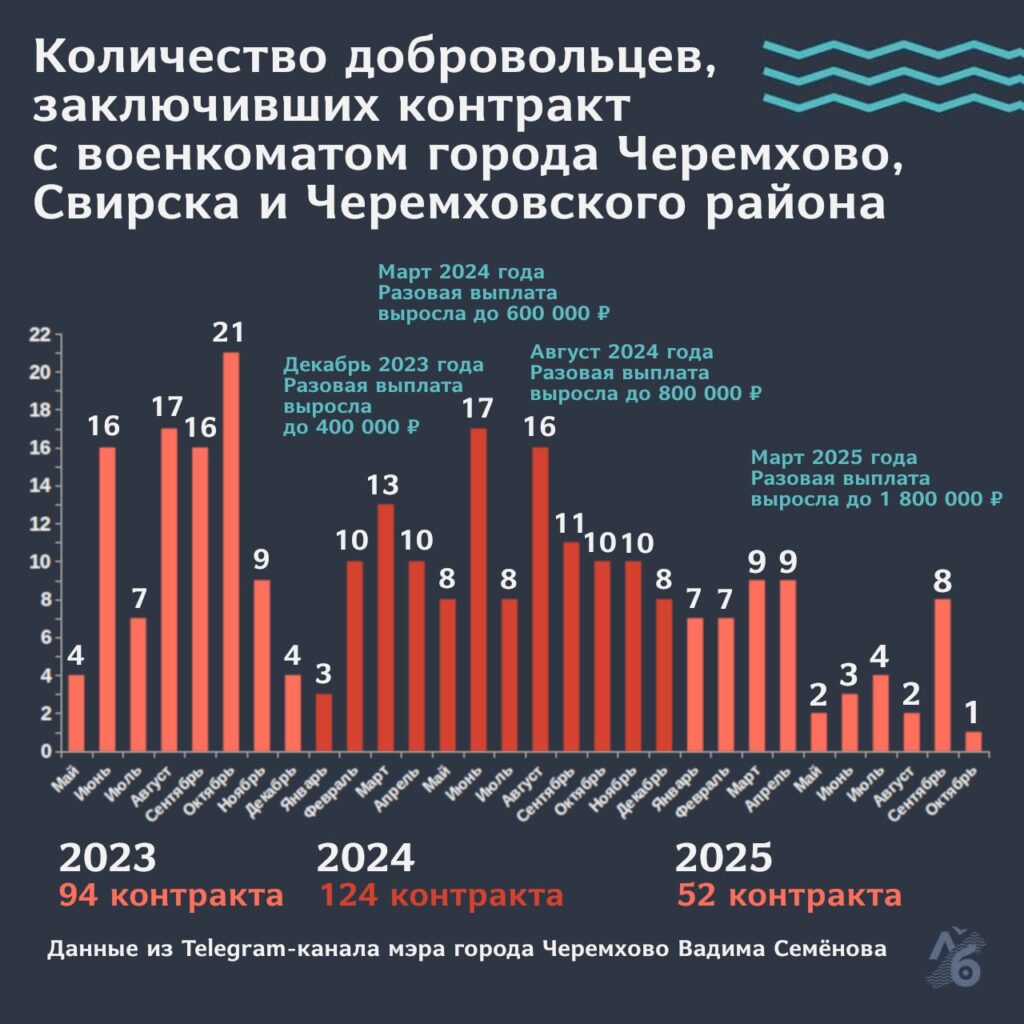 В 2023 и 2024 году черемховский военкомат отправлял на войну в среднем по десять человек в месяц. Самым успешным был октябрь 2023 года, когда за месяц  контракт подписал сразу 21 человек. Постепенный спад начался в сентябре 2024 года, а  в 2025 году поток добровольцев сократился уже в два раза — в среднем до пяти человек в месяц. В октябре за целый месяц контракт подписал лишь один человек.