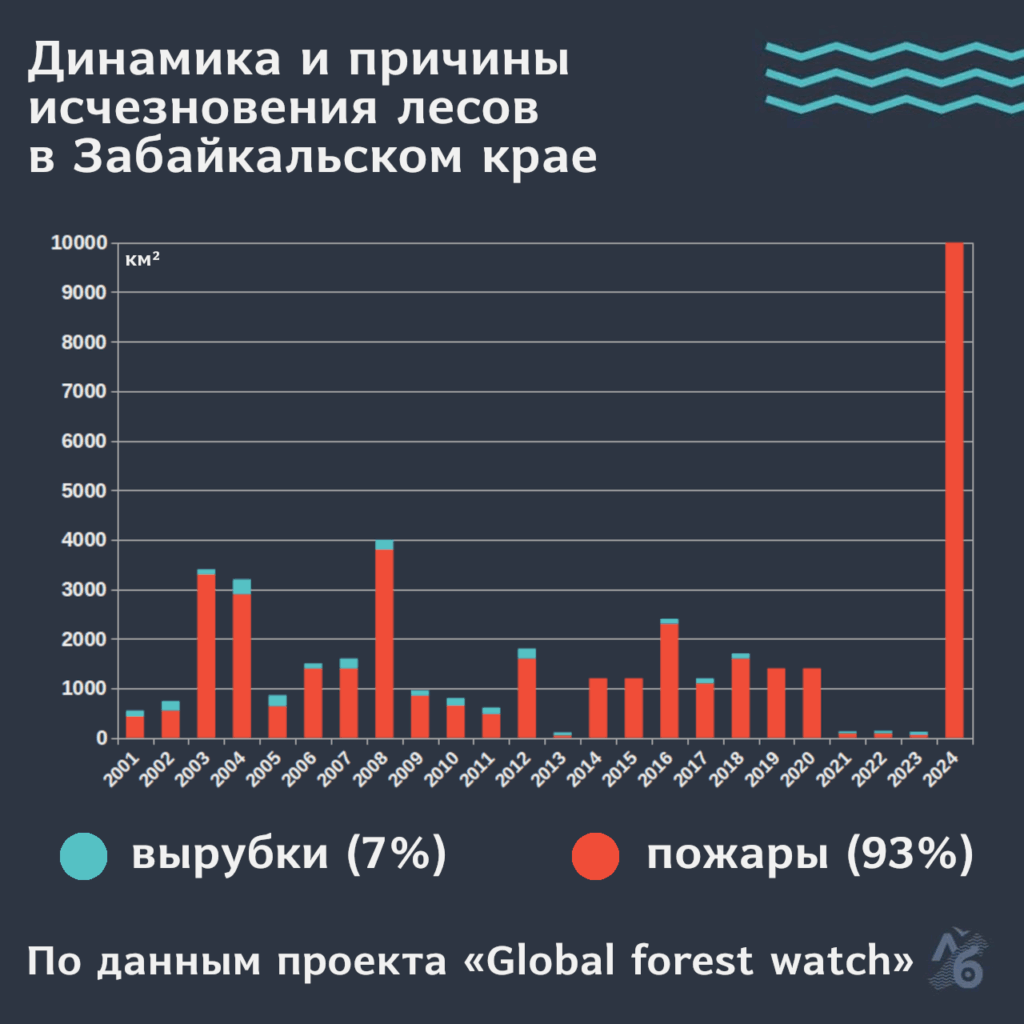 Забайкальский край потерял 4,3% своих лесов. Это 11 100 км² — сопоставимо с площадью Катара. Пожары стали причиной гибели 93% лесов, а на вырубки пришлось 7%.