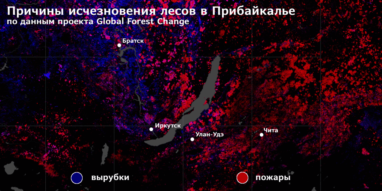 78% всех исчезнувших лесов Сибири и Дальнего Востока погибли по вине пожаров. А на долю вырубок пришлось 22%. На космсонимках хорошо видно, что пожары преобладают к востоку от Байкала, а к западу леса исчезают в основном из-за вырубок. Это связано прежде всего с тем, что в Приангарье растет качественный строевой лес, который интересует лесопромышленников в первую очередь.
