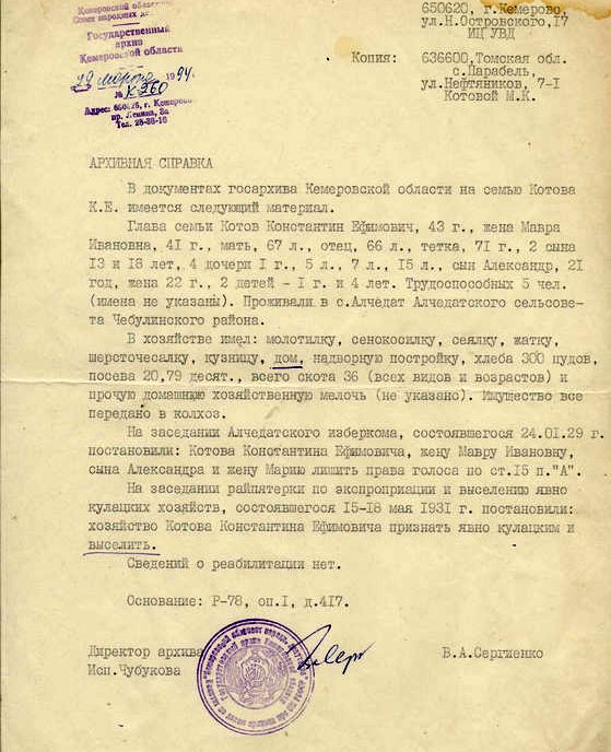 Мария Котова ушла из жизни в свой 85-й день рождения. И хотя Наталия провела рядом с матерью почти всю жизнь, подробности событий 1930-х годов долгое время были ей неизвестны. В советские годы о раскулачивании почти не разговаривали, как это часто бывало в семьях репрессированных: «Мы знали друг о друге много. Но одна страница жизни — время раскулачивания и ссылки, оставалась в забвении. Мама пыталась время от времени что-то рассказать, но натыкалась на наше непонимание и нежелание слышать».